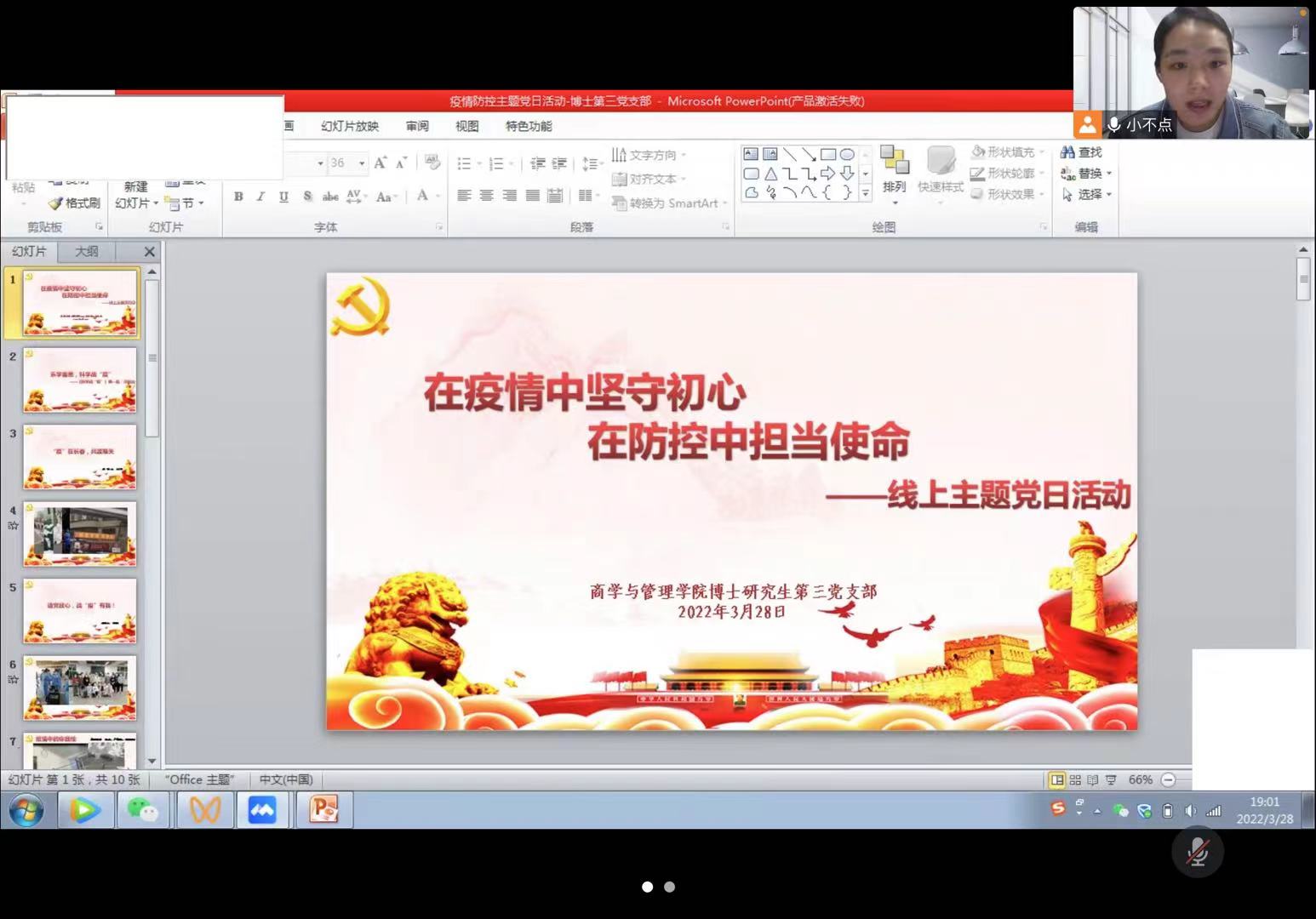 博士研究生第三党支部在线上腾讯会议开展了以“在疫情中坚守初心,在防控中担当使命”为主题的党日活动,鼓励支部党员投身于抗击疫情的工作中,坚守初心共同抗疫。