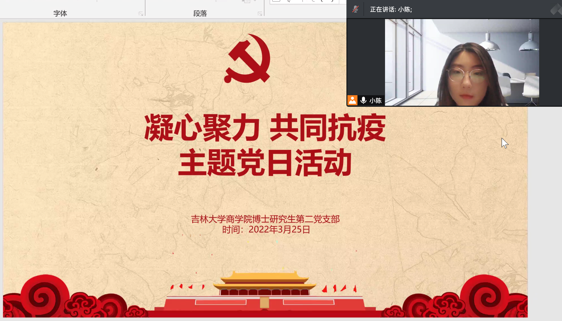 本次党日活动主要分为三个流程,首先由支部书记陈婉莹同志对3月13日封寝以来的情况与工作进行了梳理与说明,组织大家观看青春吉大视频号发布视频“P站