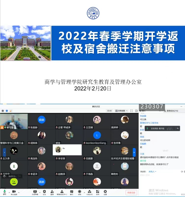 于2022年2月20日上午召开线上研究生管理工作会议,参加会议的有学院党委副书记马腾老师、研究生辅导员裴月莹老师和全体涉及公寓搬迁工作研究生,会议由裴月莹老师主持。