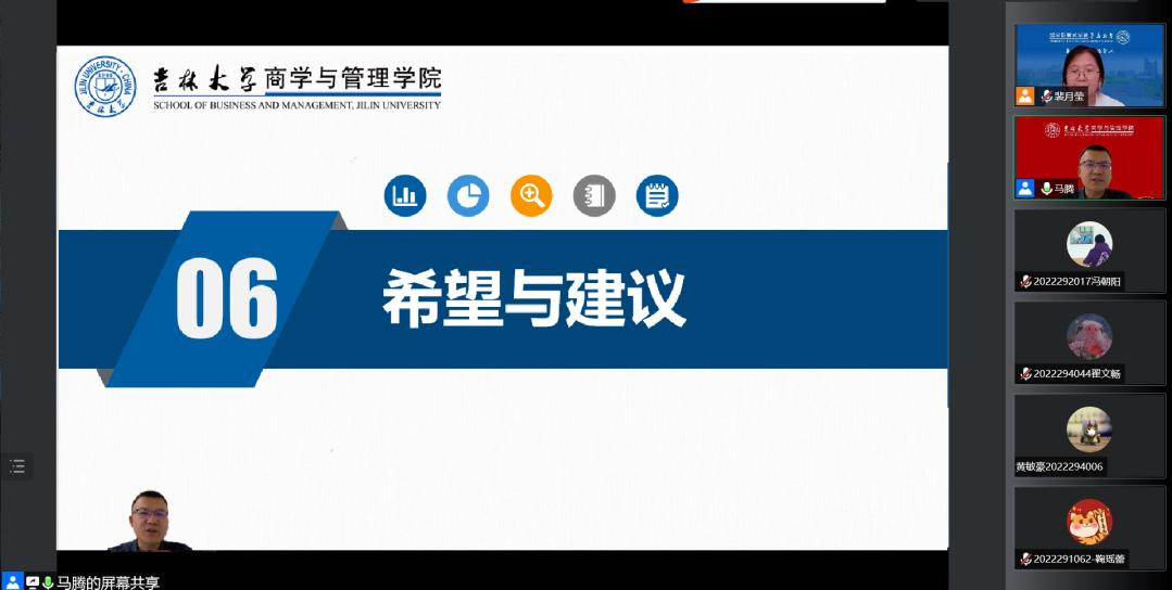 最后,马腾老师在学习和生活方面对大家提出了几点要求。在学术研究中,要将做学问作为自己的目标,培养独立思考的能力,遵守学术规范。在心理和生活上,要珍爱生命,学会排解情绪和释放压力。作为当代青年,我们要时刻坚定理想、执着信念、不怕困难、勇于开拓,这也是习总书记在各高校考察时对青年朋友的寄语。